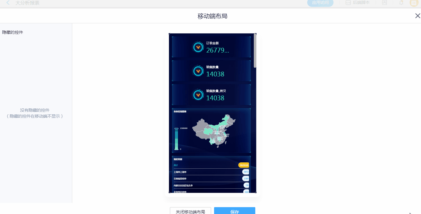 - 在移动布局中,可以自定义各个控件在移动端的展示位置、是否展示。用户可以根据需要,在此处优化报表移动端的排版。