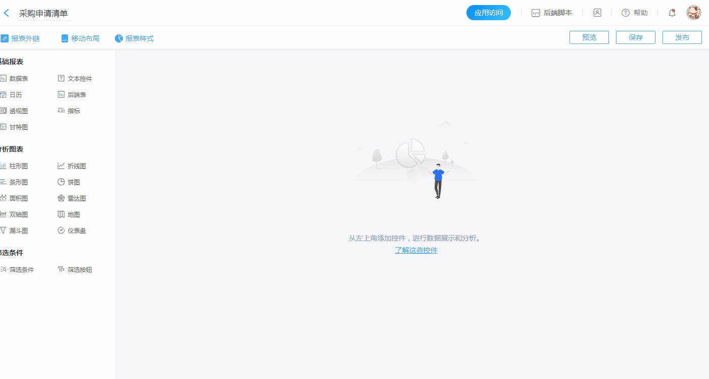 本章主要以采购为例,员工提交采购申请,领导可在报表查看具体的申请明细,并可选择多条采购申请数据分配给相应的人进行采购,申请明细会写入采购清单的子表单中。