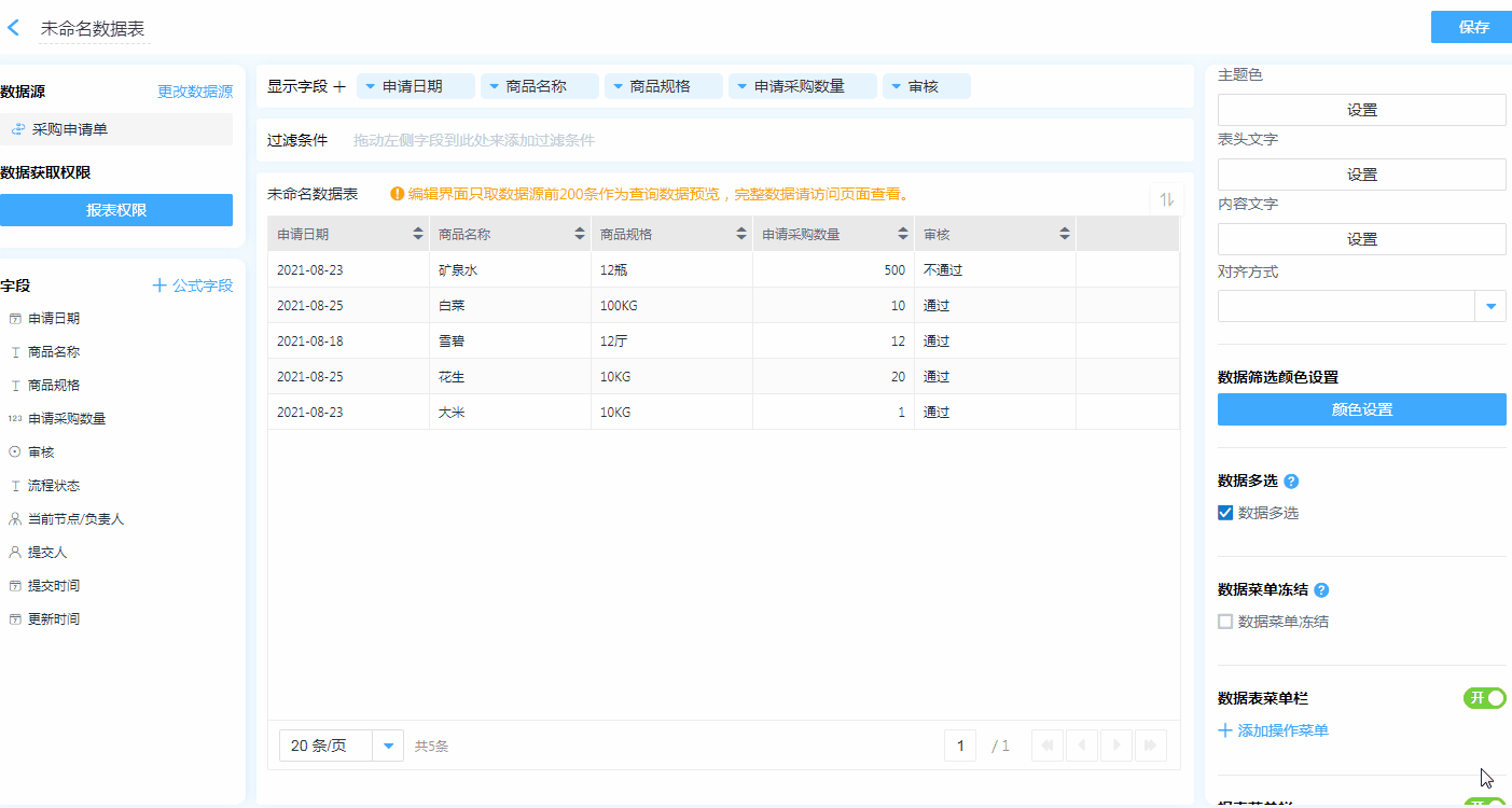 第一步:我们需拖拽一个数据表进行编辑操作,【添加数据源】——【设置显示字段】——【勾选数据多选】