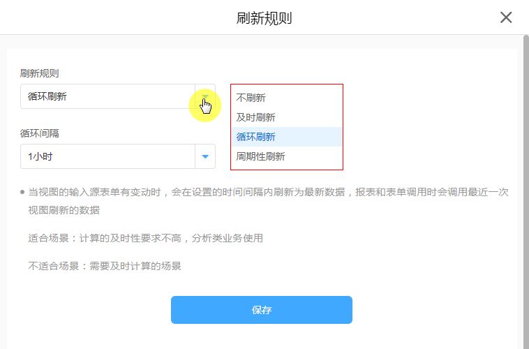 - 设置数据视图的刷新规则,设置规则后会定时在天/周/月/年的某天某个时间刷新数据,报表和表单调用时会调用最近一次的视图刷新的数据。一般用于大数据量时,周期性汇总分析时使用。