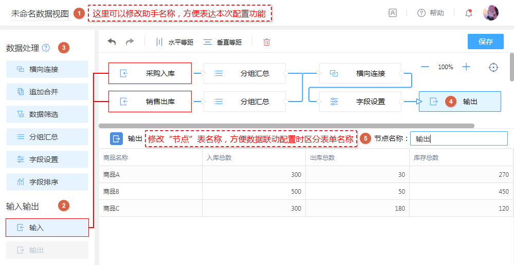 | ② | 输入节点 | 可配置多个,引用真实表数据进行视图处理。 |