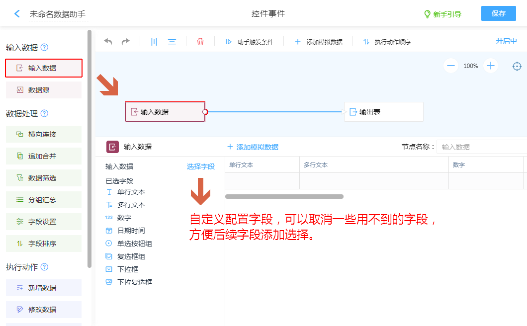 新建配置,节点“输入数据”默认存在,有更多需求可以配置多个使用。