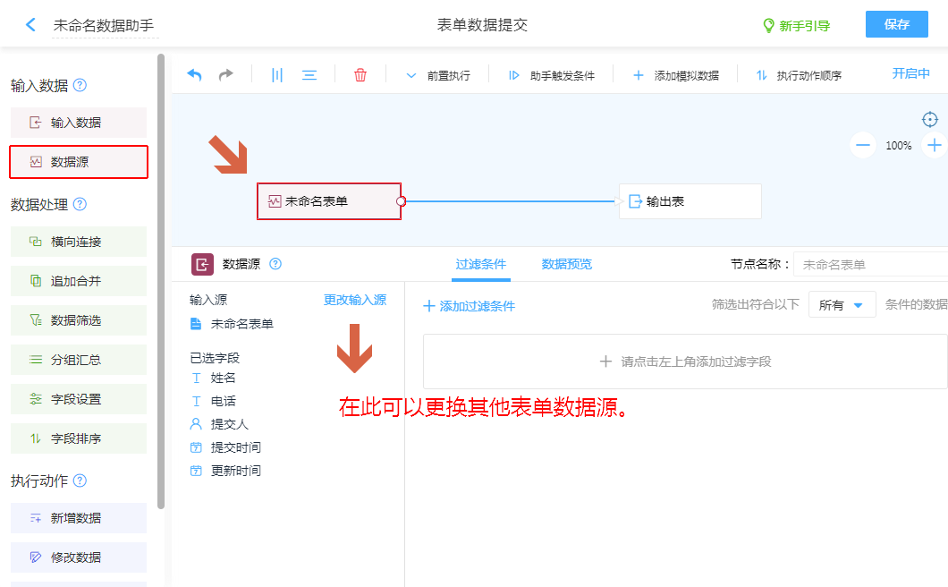 配置指定表单“历史数据”传入数据助手处理。