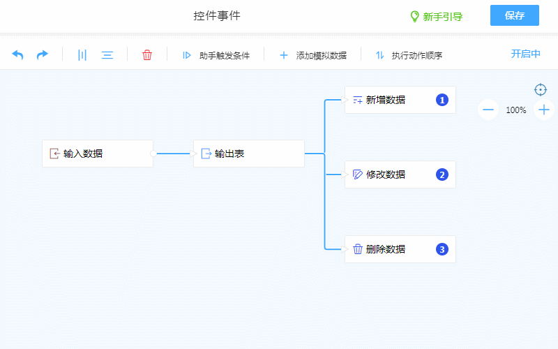 | ④ | 助手触发条件 | 根据“输入数据”与“子表单当前行”节点传入的数据进行条件判断,成立则执行助手功能。 |