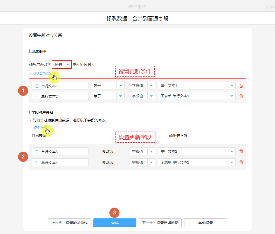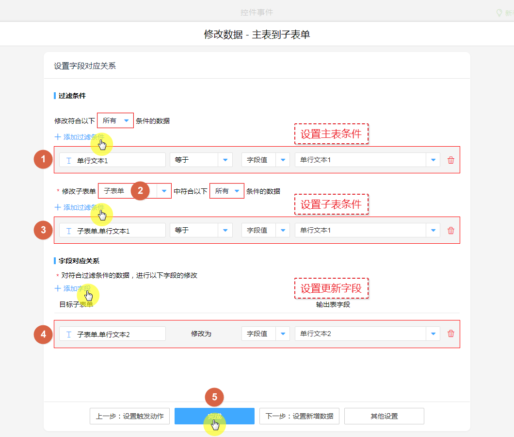 ④、设置子表单更新字段。