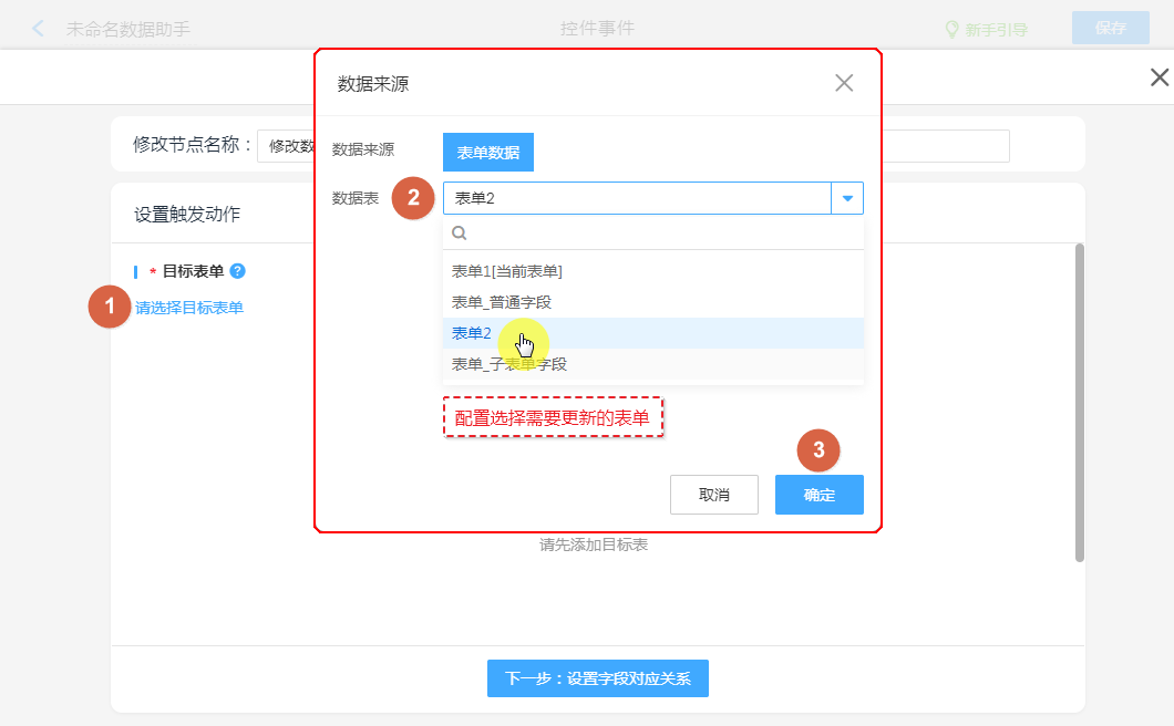 ③、设置子表单更新字段。