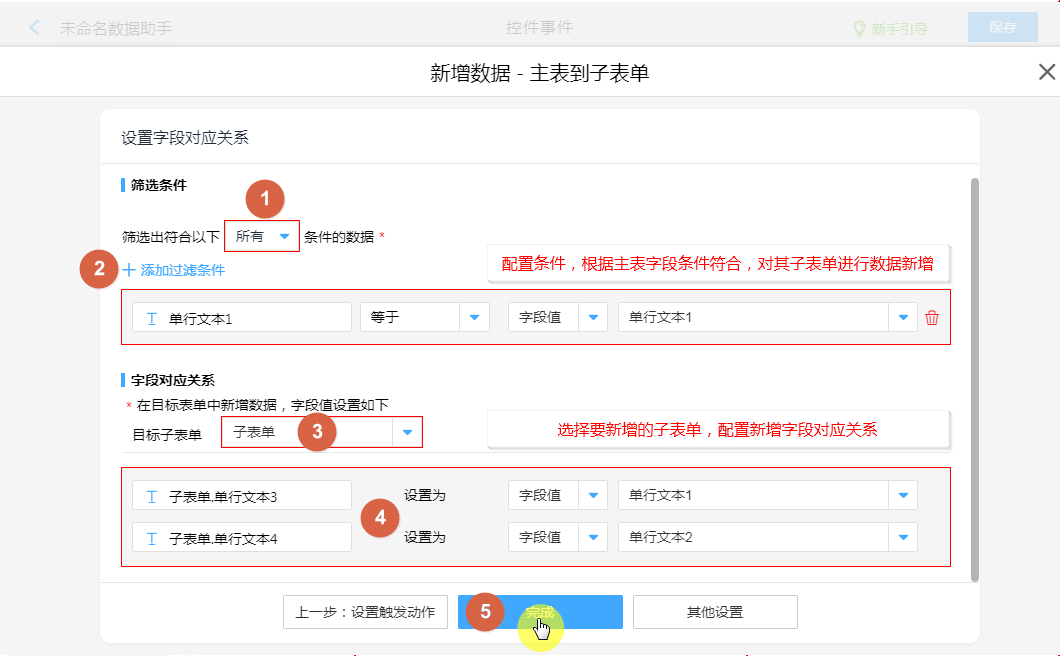 创建“新增数据”动作节点,将“输出表”的数据新增至其他表单。