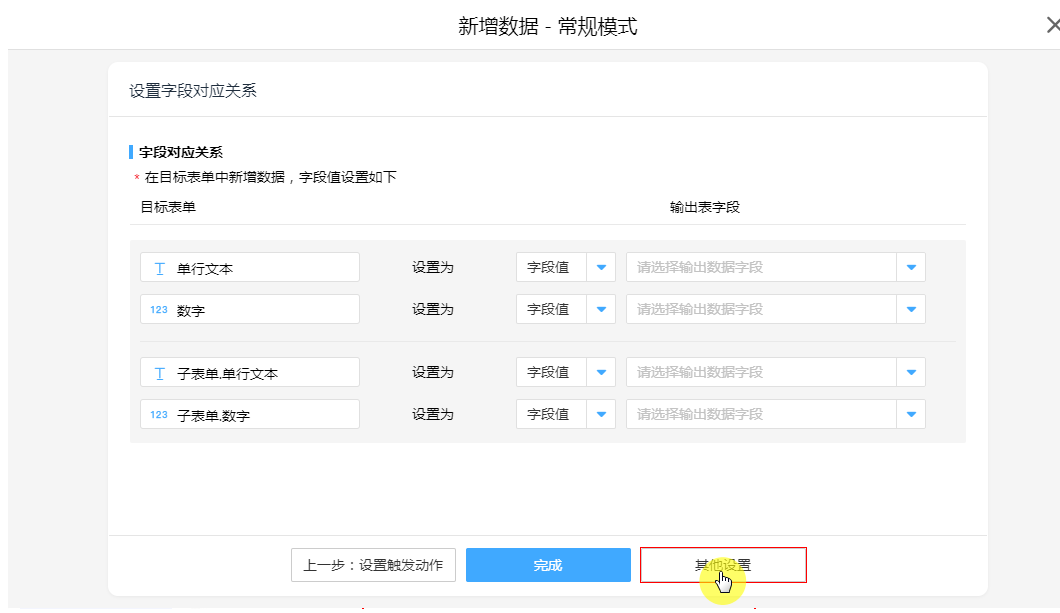 5 种动作节点均在“设置字段对应关系”界面右下方可查看到“其他设置”配置按钮。