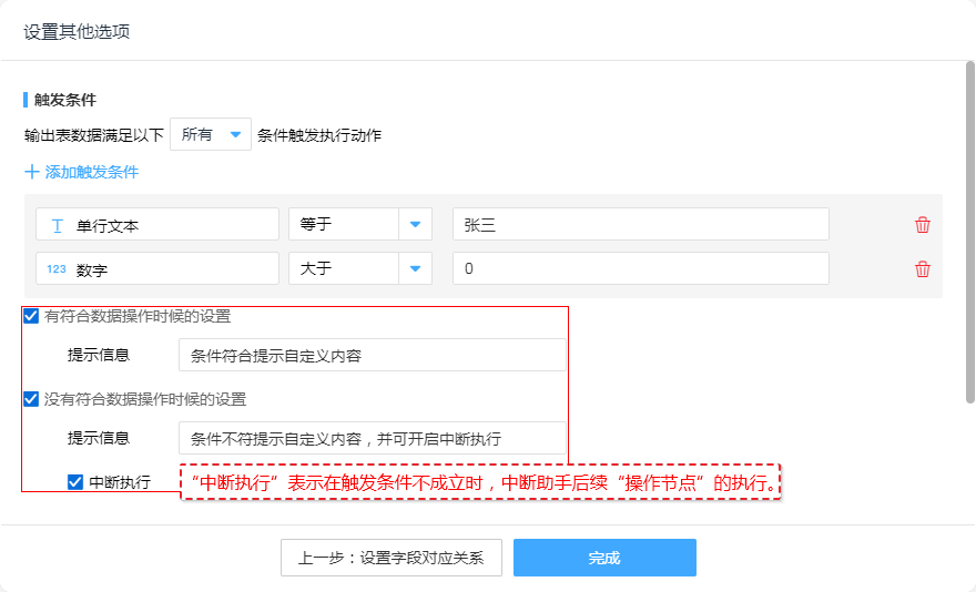 - “中断执行”表示在触发条件不成立时,中断助手后续“操作节点”的执行。